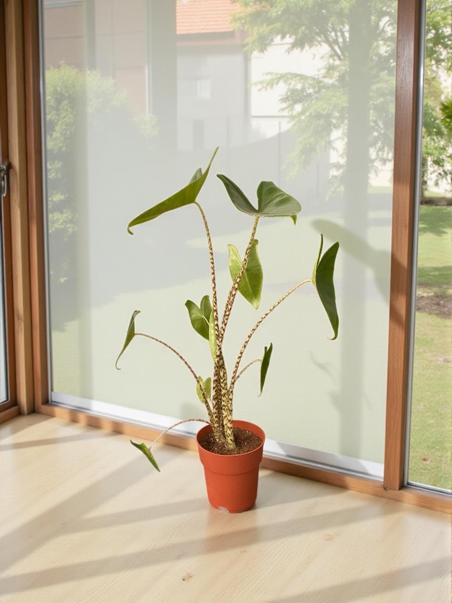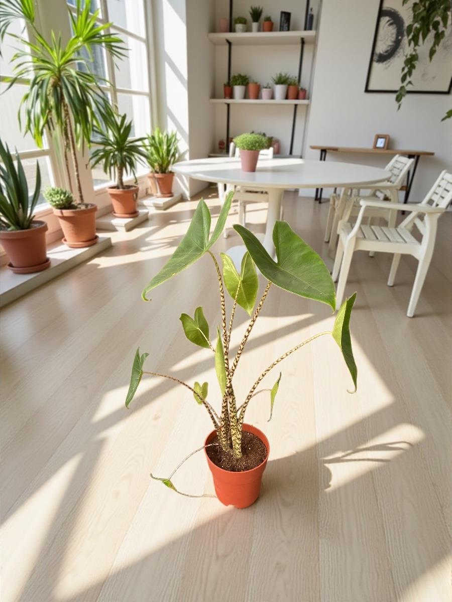 Tropik Zebra Alocasia, siyah-beyaz zebra desenli sapları ve geniş, ok şeklindeki yapraklarıyla iç mekân bitkileri arasında en dikkat çekici dekoratif türlerden biridir. Tropik duruşu ve heykelsi formu sayesinde bulunduğu her alanın odağı olur.