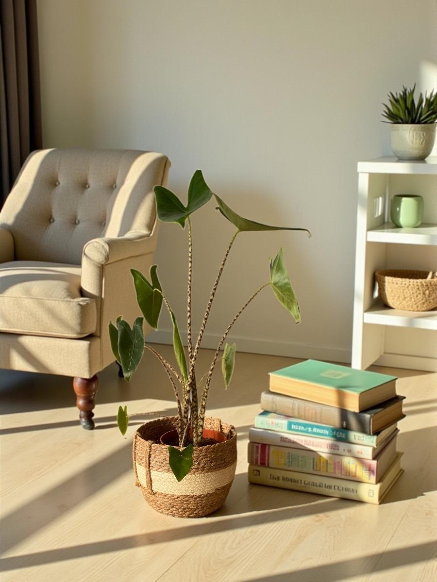 Tropik Zebra Alocasia, modern, minimal ve doğal tonlarla tasarlanmış mekânlarda heykelsi bir obje gibi durur. En iyi etkiyi siyah, beyaz, beton ve ahşap tonlarında saksılarla verir. Salon köşeleri, giriş holleri ve çalışma alanlarında dramatik bir atmosfer yaratır.