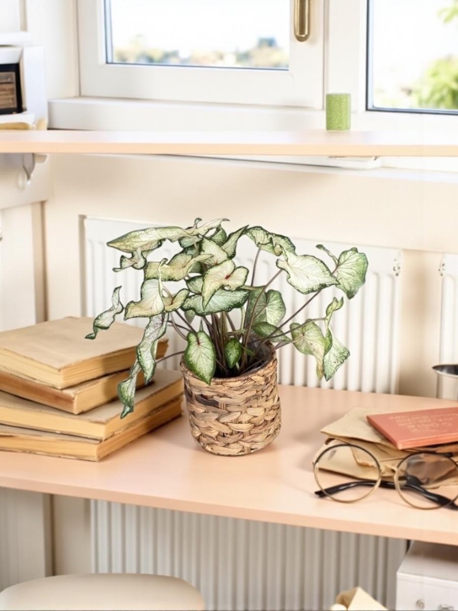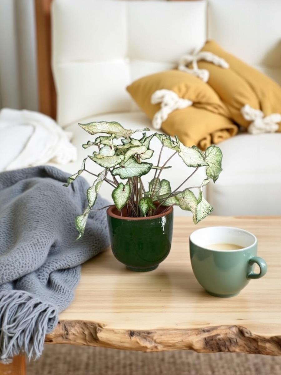 Caladium White Wonder’ı şık bir seramik saksı ile salon veya ofisinizde konumlandırarak etkileyici bir bitki köşesi oluşturabilirsiniz. Farklı boy ve türleriyle mini bir botanik köşesi yaratabilirsiniz.