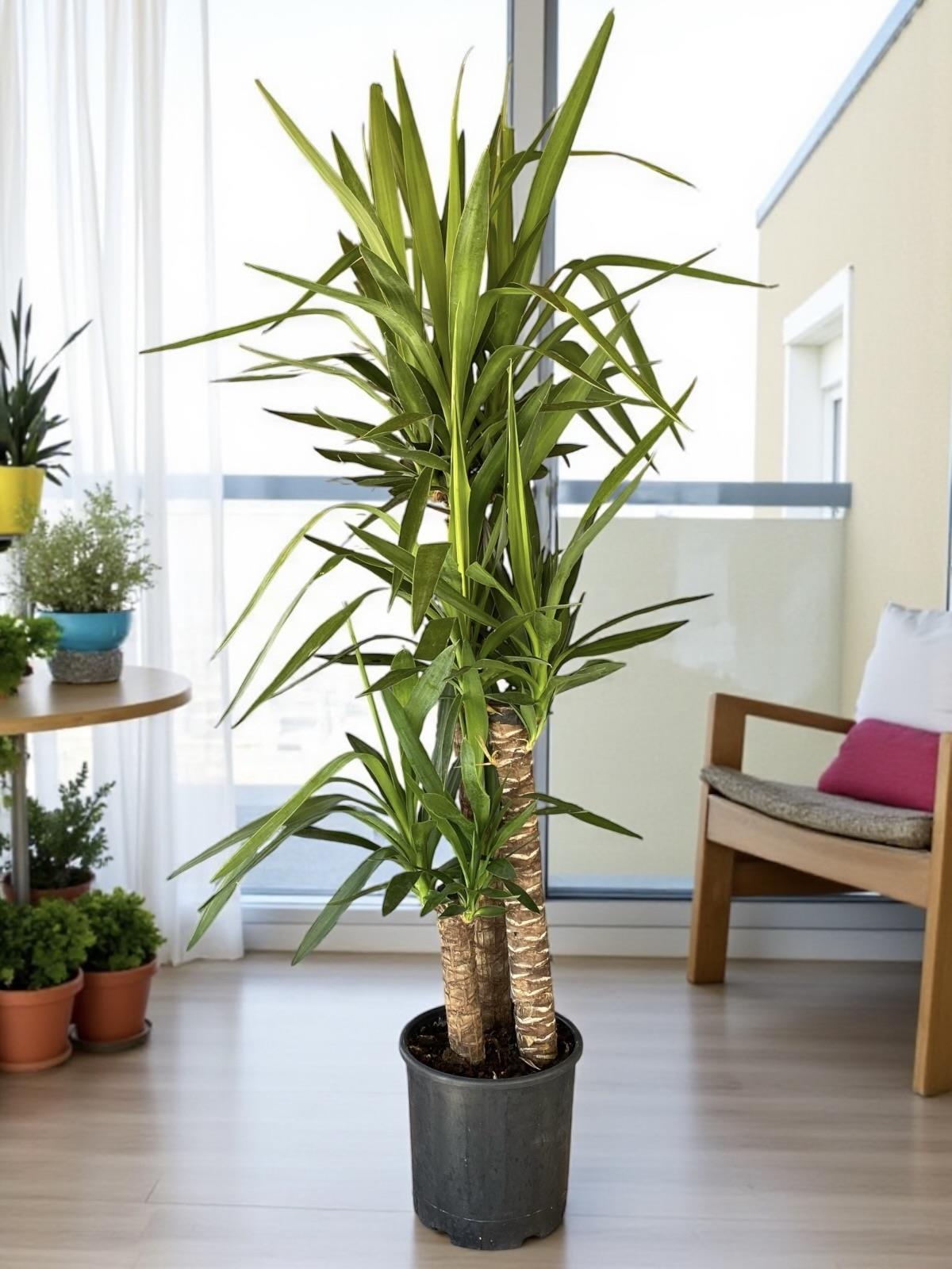 Bitkileri büyük saksılarla konumlandırarak tropik ve modern bir botanik köşe yaratabilirsiniz. Alacalı Benjamin Starlight’ın yaprak desenleri ve Yuka’nın yüksek formu mekâna şıklık katar.
