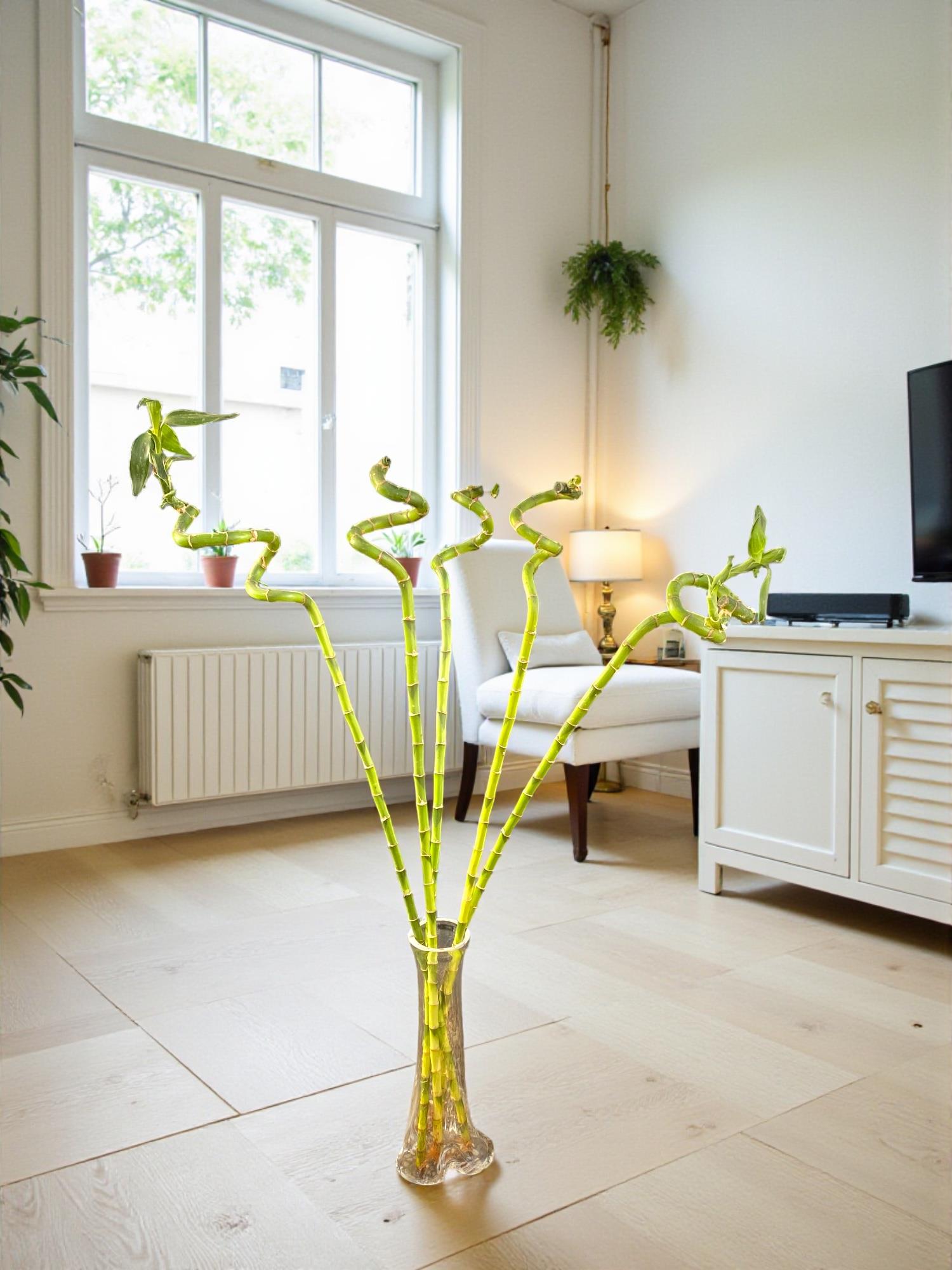 Bu boyuttaki bir bambu, şeffaf uzun silindir vazolarla modern dekorasyonun zirvesini temsil eder. Vazonun dibine beyaz doğal taşlar veya su kristalleri ekleyerek hem kökleri sabitleyebilir hem de spa merkezi ferahlığında bir görünüm elde edebilirsiniz.