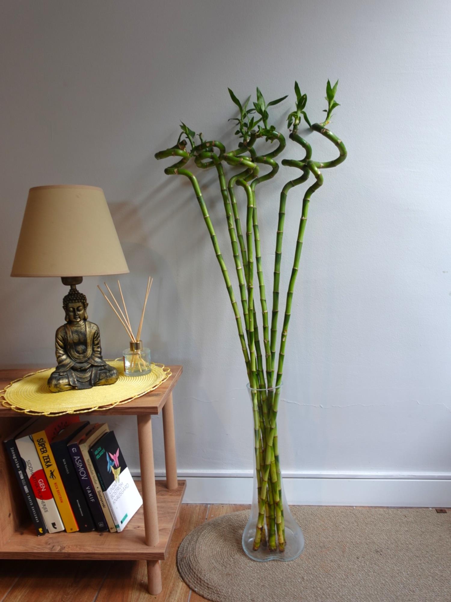 Bu dev boydaki bambu seti, salon köşelerinde, antre girişlerinde veya ofislerin karşılama masalarında mükemmel bir duruş sergiler. Cam vazonun içine ekleyeceğiniz doğal çakıl taşları veya dekoratif boncuklar, bitkinin köklerini sabitlerken görselliği daha da yukarı taşıyacaktır. Minimalist ve zen tarzı dekorasyonların en güçlü parçasıdır.